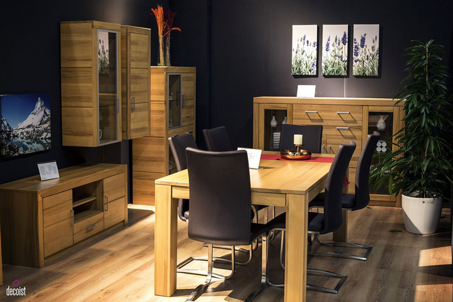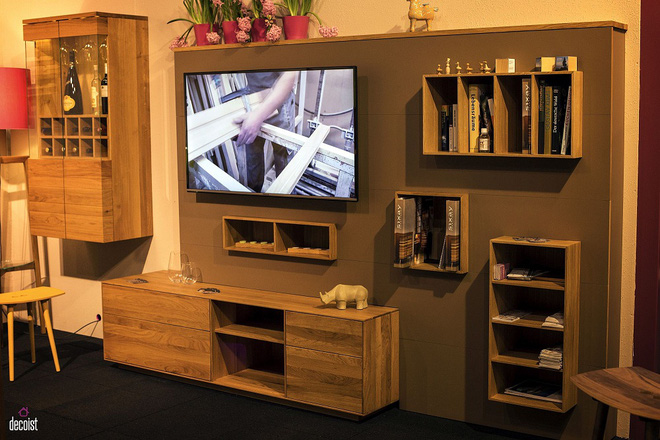 Một bức tường với sự hiện diện đầy ắp của các thiết kế kệ gỗ nổi, lớn bé đủ cả. Hệ thống các kệ gỗ nổi mang lại một không gian lưu trữ cực lớn, nào là đựng rượu quý, sách báo tạp chí, kệ tivi, … Trang trí nhà đẹp mang đậm dấu ấn cá nhân bằng thiết kế kệ gỗ nổi trên tường như thế này hiển nhiên là ý tưởng được rất nhiều chủ nhà ưa phong cách chuộng.