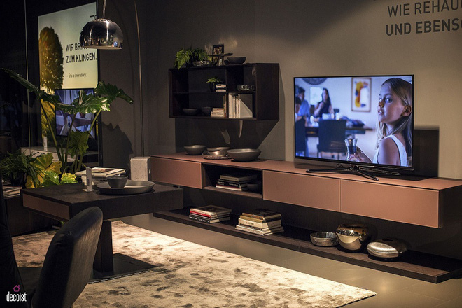 Bạn khó có thể rời mắt khỏi thiết kế kệ gỗ nổi đặt tivi trong không gian phòng khách này. Màu sắc của thiết kế kệ gỗ này rất hài hòa khi đặt trong căn phòng vốn toàn gam màu trung tính. Cạnh đó ở về phía trên bên trái cũng là thiết kế kệ gỗ nổi được phủ lớp sơn màu đen hòa hợp tuyệt đối với không gian phòng khách được dùng như giá sách. Rõ ràng, phòng khách này đẹp cá tính, ấn tượng hơn có sự góp công không nhỏ của các thiết kế kệ gỗ nổi trên tường.