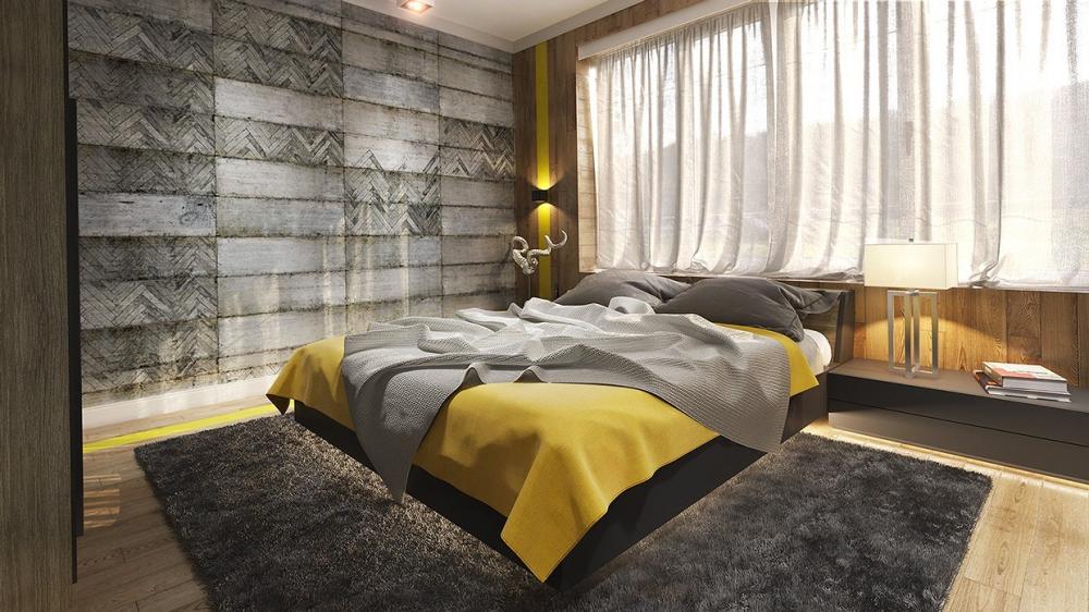 Tường xi măng làm nền cho phần tường gỗ tạo vẻ đẹp ấm áp, cuốn hút cho phòng ngủ.