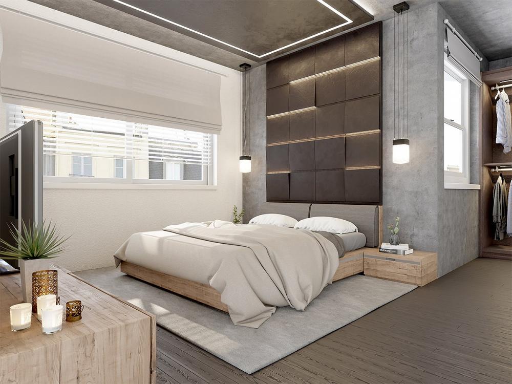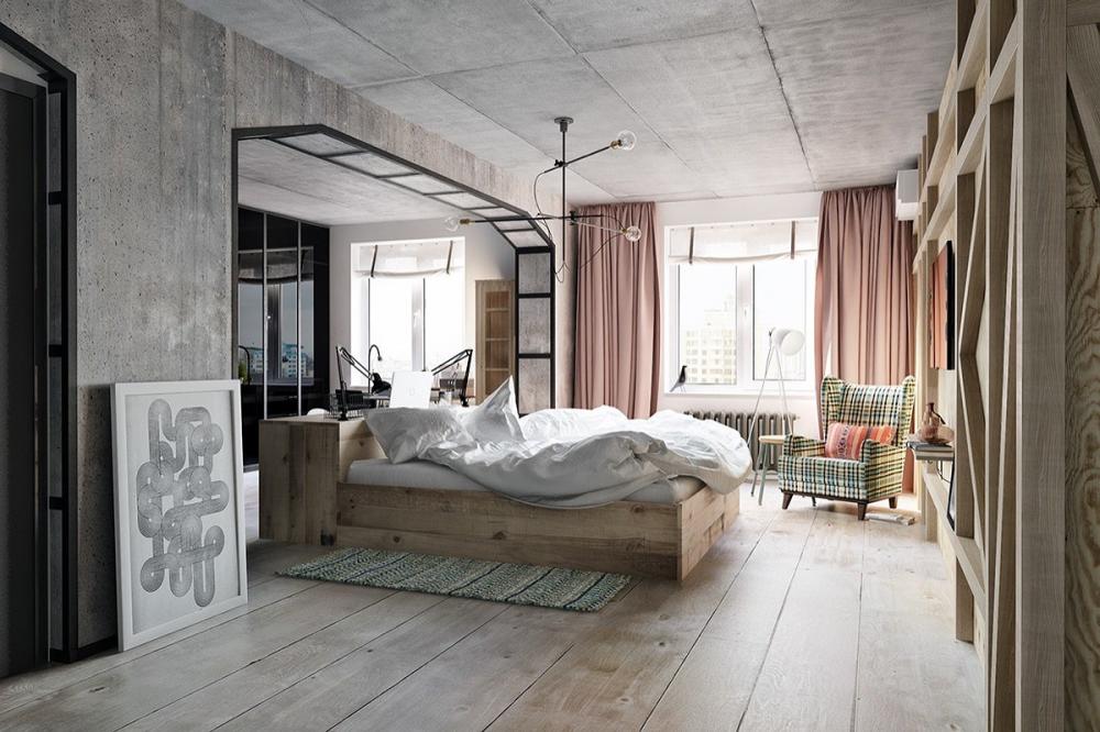Trang trí phòng ngủ với giường bệt và tường bê tông là sự kết hợp tương phản