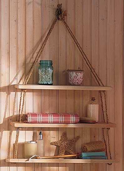 Để làm một chiếc kệ dây thừng treo xinh xắn, bạn cần chuẩn bị 3 – 4 miếng ván gỗ có kích thước bằng nhau và một cuộn dây thừng. Tiếp đó hãy đánh dấu bốn góc của mỗi tấm ván rồi dùng khoan để khoan các lỗ tròn. Cuối cùng bạn luồn dây thừng qua các lỗ khoan, thắt nút cố định ở tầng cuối và giữa các tầng để hoàn thành tác phẩm.