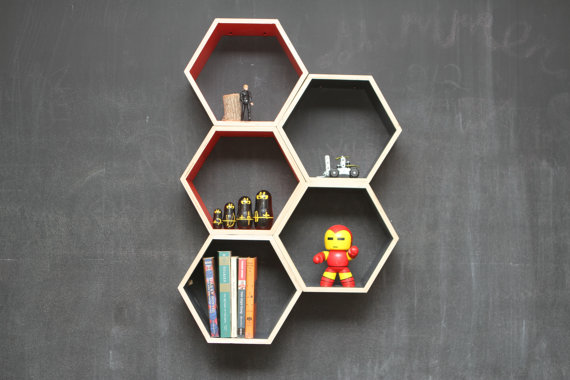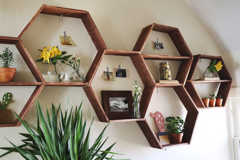 Thoạt nhìn loại kệ này có vẻ khó làm tuy nhiên cách thực hiện nó lại không quá khó. Đầu tiên hãy dùng keo gắn các miếng gỗ thành hình tổ ong sau đó dùng đinh đóng các cạnh lại cho chắc rồi treo lên tường. Để tăng độ chịu lực cho chiếc giá, ở dưới những tấm ván trực tiếp đặt đồ, bạn nên khoan thêm các miếng đỡ bằng sắt.