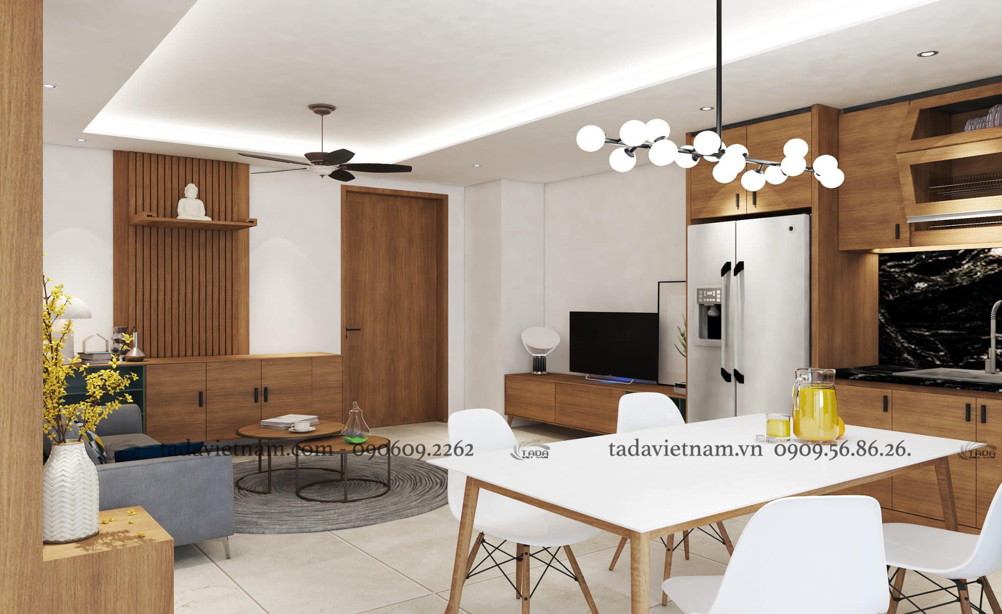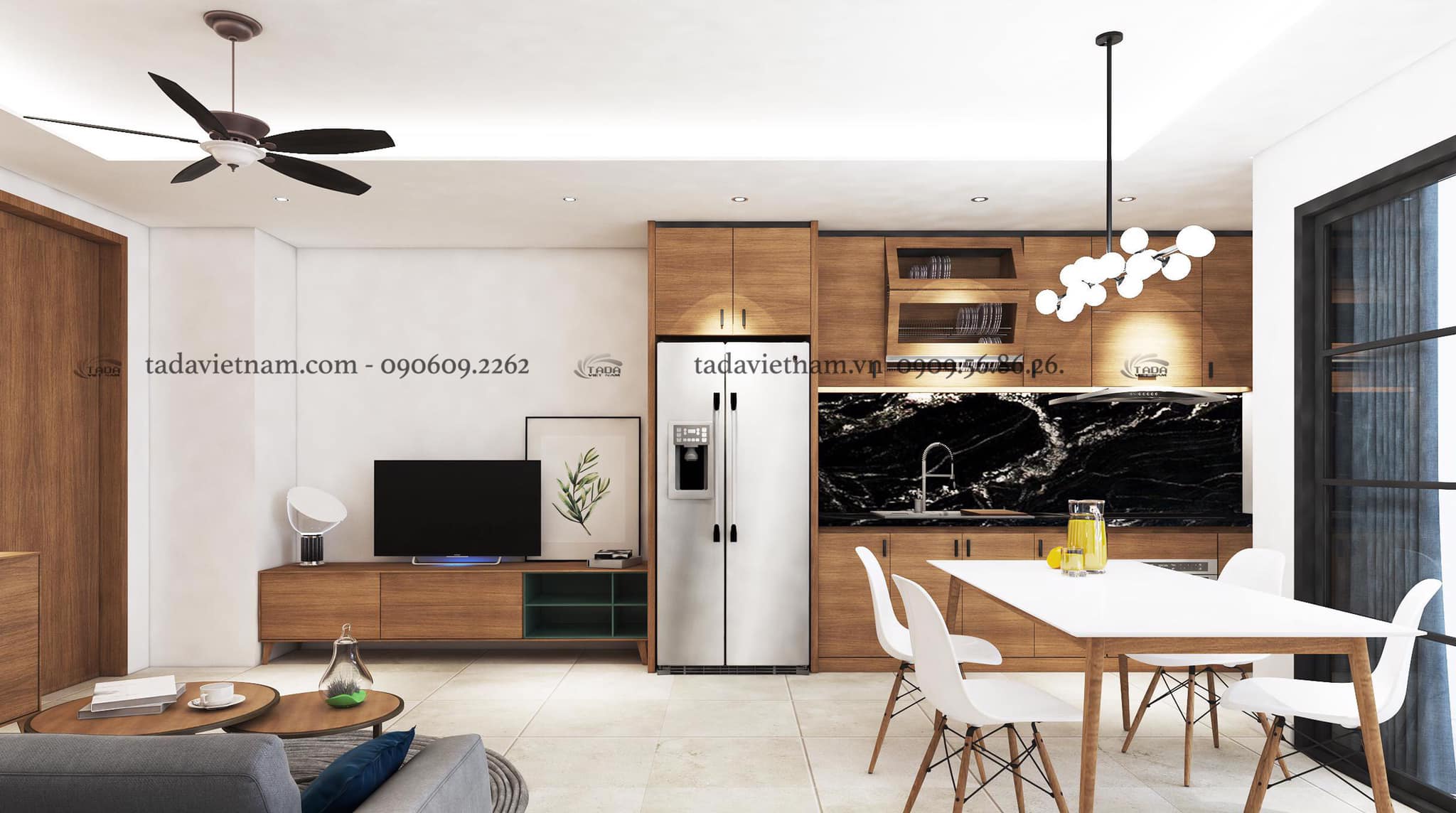 Thiết kế phòng khách liền bếp tạo cảm giác rộng rãi, thông thoáng, phù hợp với căn hộ chung cư có diện tích không quá lớn