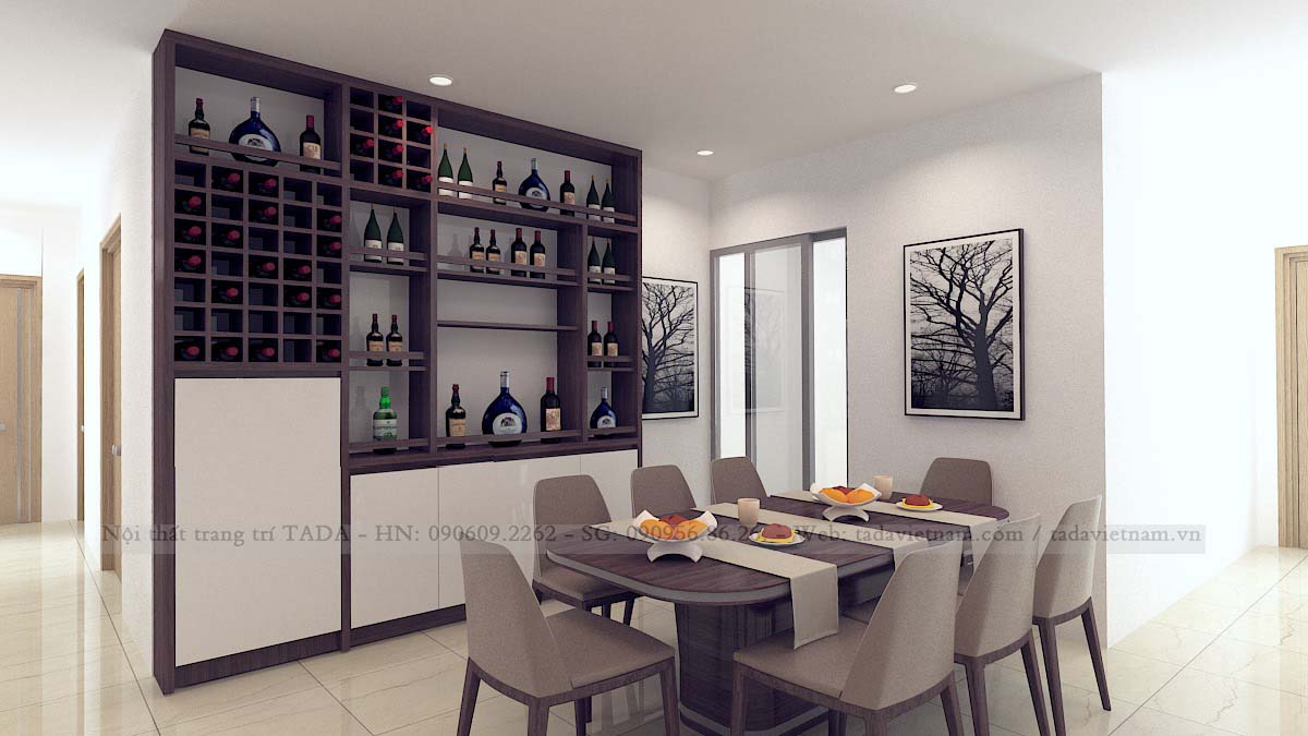 Với khu vực phòng ăn, Một chiếc kệ rượu cỡ lớn kịch trần để trưng bày vài chai rượu quý đã giúp không gian sang trọng rất nhiều.