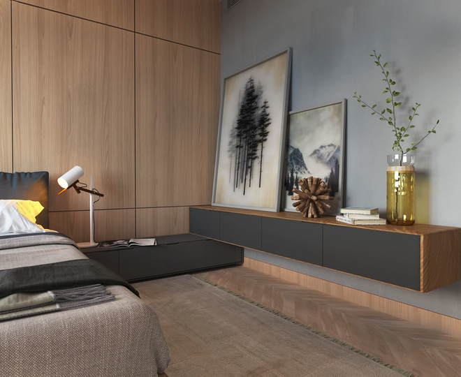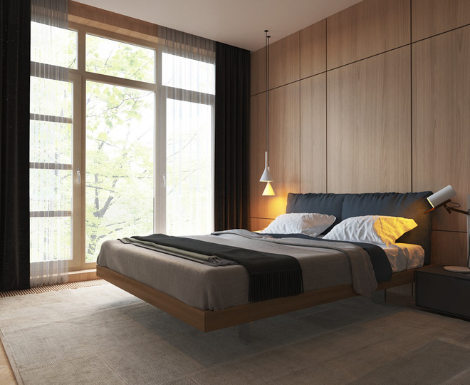 Có lẽ điều ấn tượng nhất trong phòng ngủ này chính là thiết kế giường kiểu hẫng, khiến cho ta có cảm giác như chiếc giường đang bay lơ lửng trong không trung. Trong một căn phòng mà nội thất được sắp xếp hợp lý như thế này thì điều này có thể trở nên nổi bật và đáng nhớ hơn so với bất kỳ chủ đề trang trí nào.