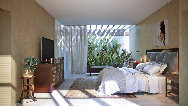 Phòng ngủ này được thiết kế theo không gian mở - kết hợp không gian trong nhà và ngoài trời qua cửa kính sát đất. Sàn gạch và những bức tường kết cấu càng làm tăng thêm sự gần gũi với chủ đề thiên nhiên.