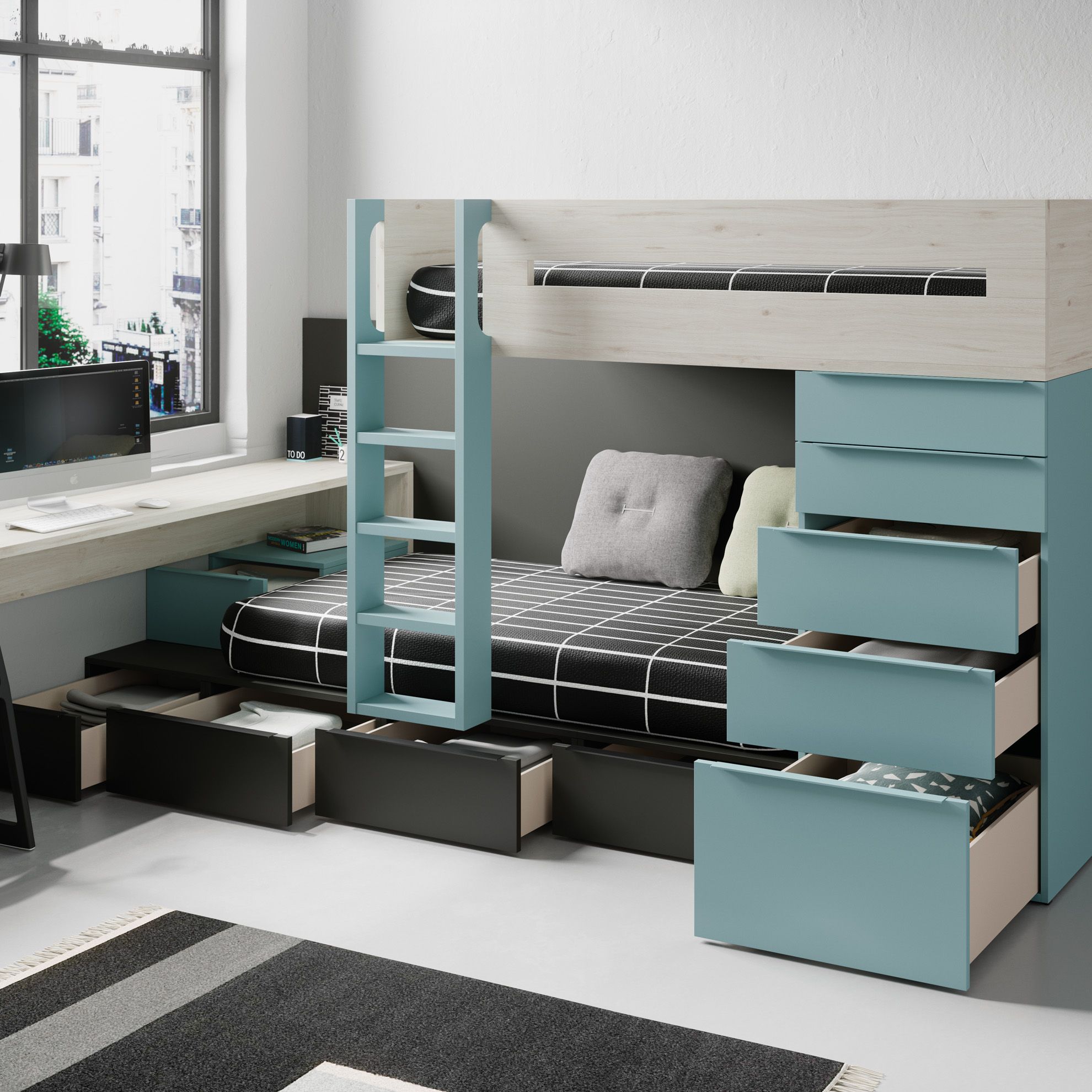 Giường tầng hiện đại với kệ và ngăn kéo đa năng