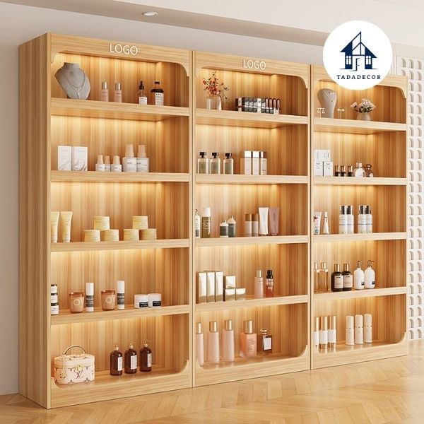 Thiết kế: Tủ treo tường nhỏ gọn, thường có 3-5 tầng kệ để trưng bày sản phẩm. Một số mẫu tích hợp đèn LED hoặc gương nhỏ để khách hàng thử mỹ phẩm.