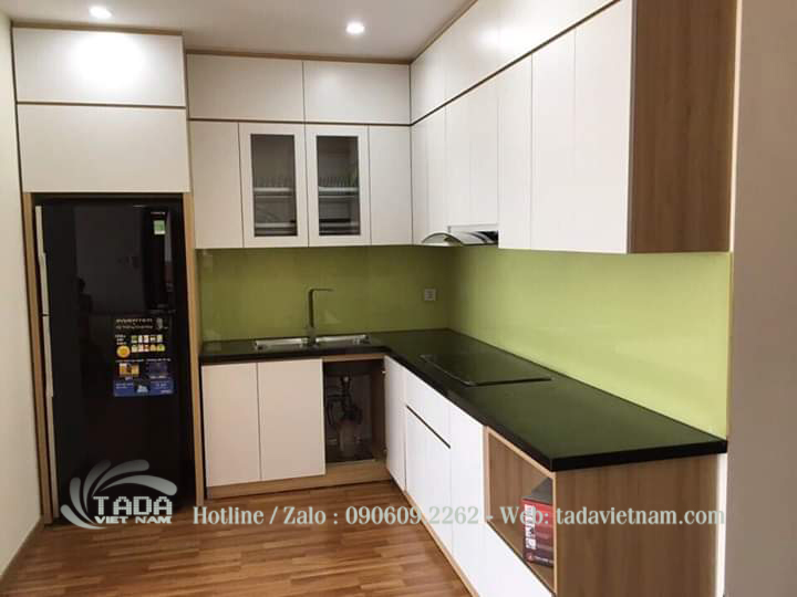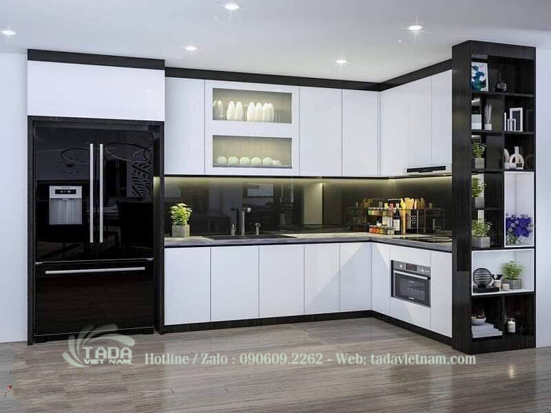 Tủ bếp chữ L trắng đen phủ acrylic
