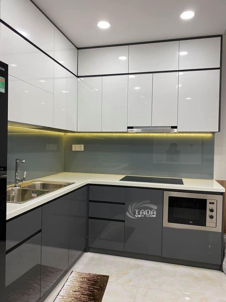 TỦ BẾP CHỮ L XÁM TRẮNG CÁNH BÓNG CỰC SANG NHÀ ANH MINH - TÂY HỒ