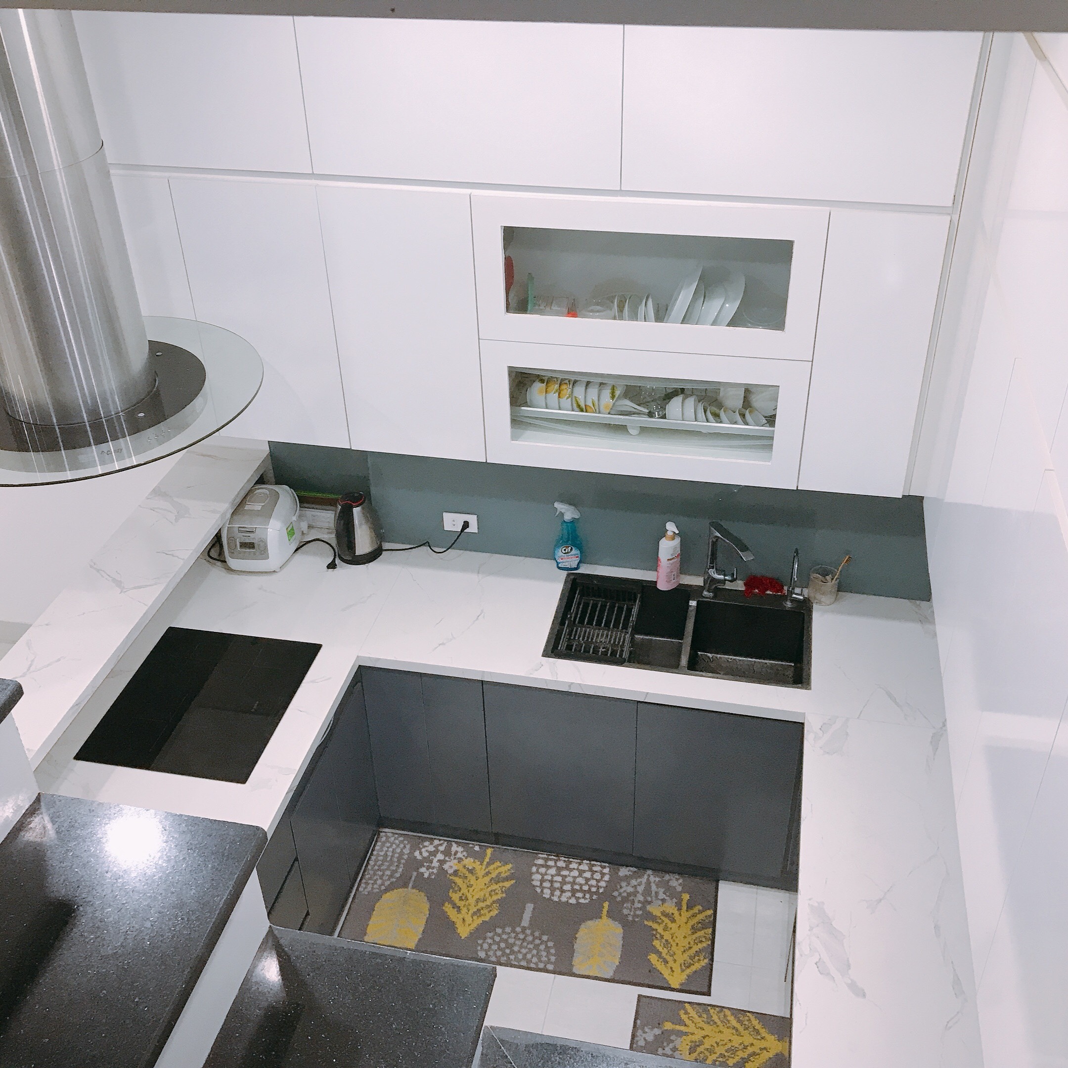 - Dưới bếp từ âm có 2 giá ngăn kéo để gia vị nấu nướng, bên cạnh dưới có 4 ngăn tủ để đồ, cạnh lò vi sóng là 2 ngăn kéo lớn để xoong nồi. Tủ trên đựng bát đĩa và các ngăn chia đợt để đồ theo nhu cầu sử dụng.