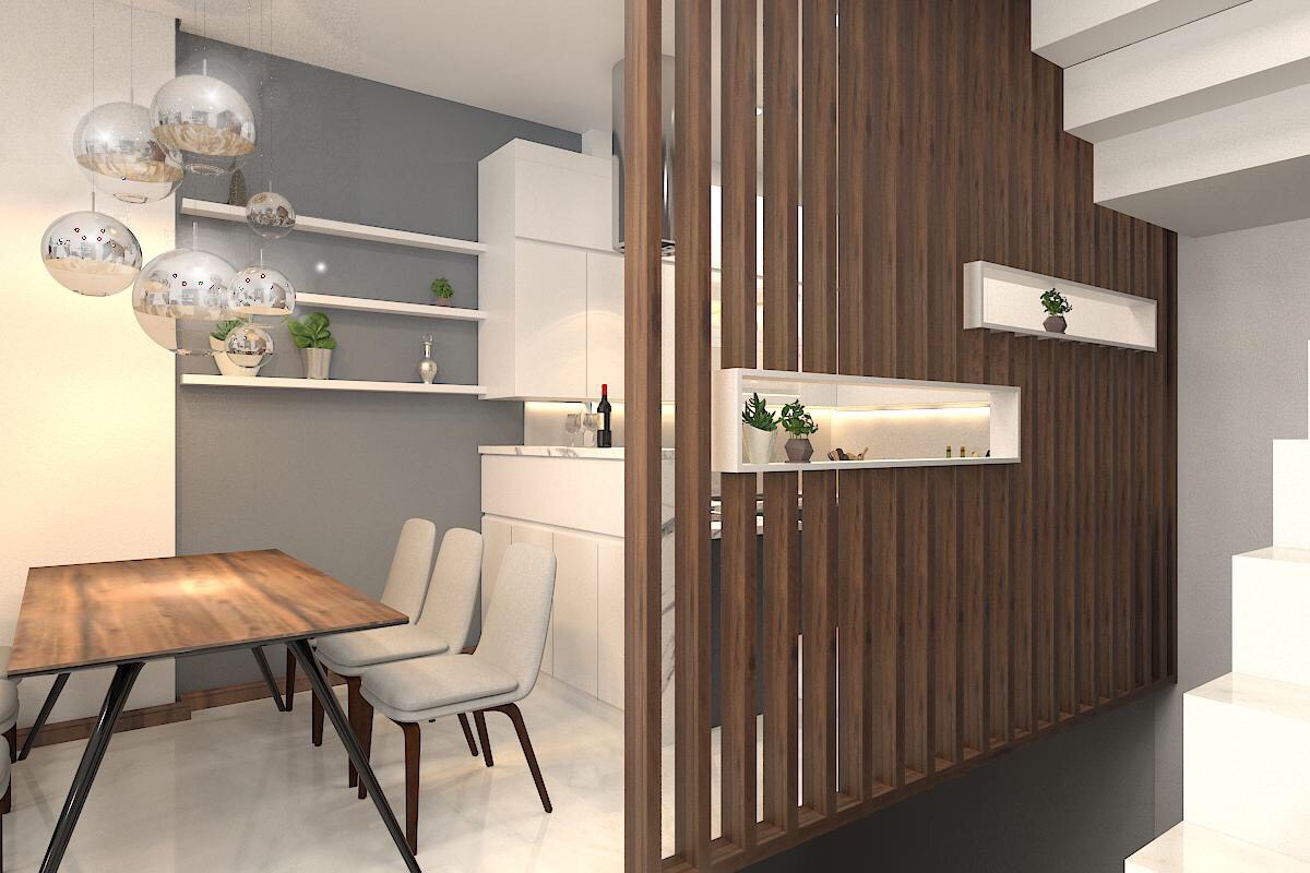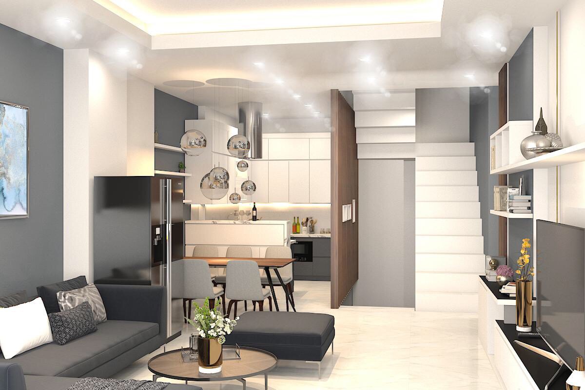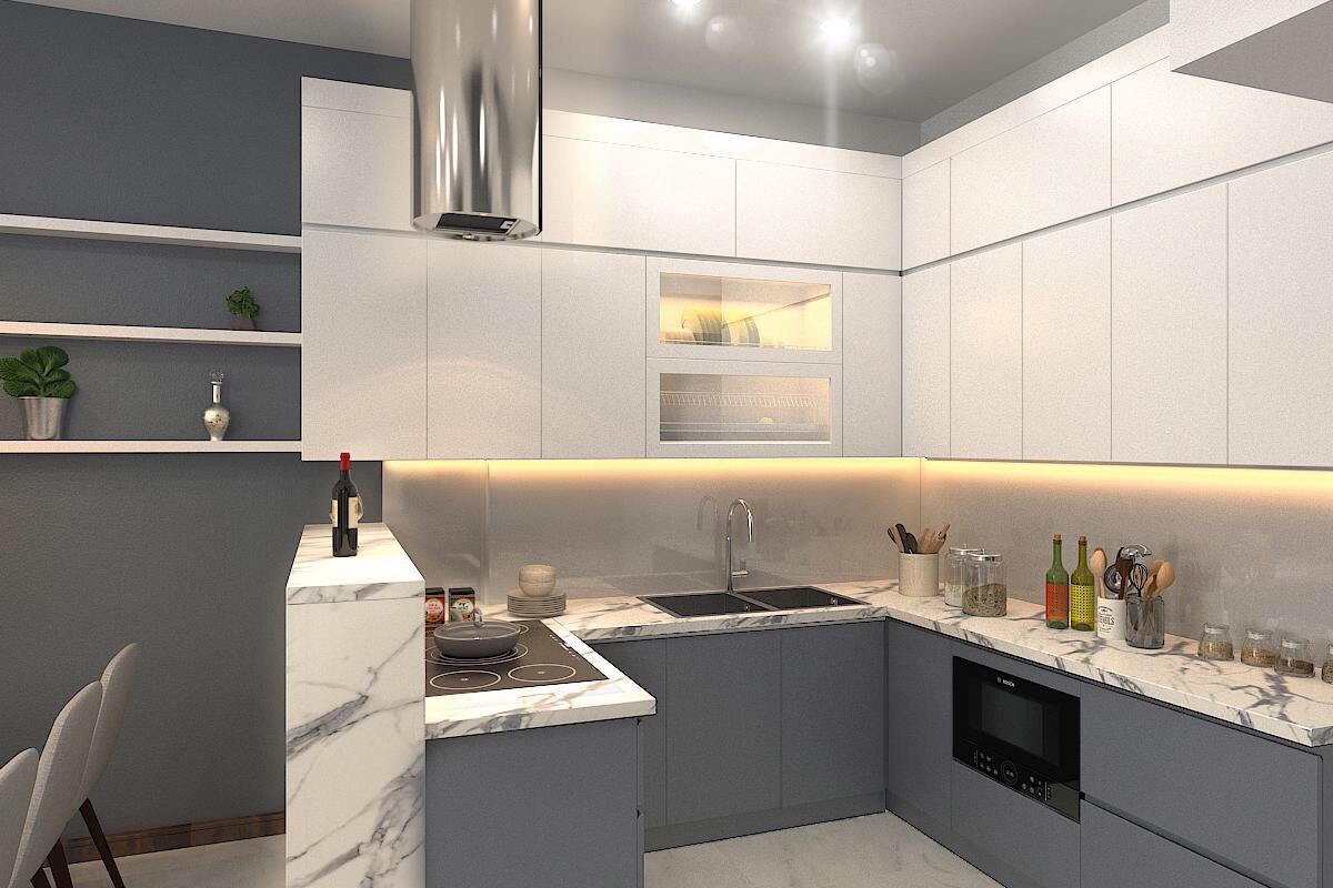 - Bộ tủ bếp nhà anh tuấn được thiết kế 3D theo phong cách hiện đại, với các công năng được bài trí thông minh, kết hợp tông màu màu xám - trắng trung tính