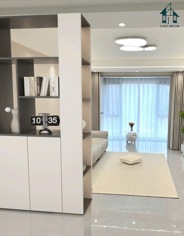 Mẫu tủ ngăn phòng đa năng được thiết kế theo phong cách tối giản với tone màu trắng – xám chủ đạo, phù hợp với nhiều không gian nội thất như căn hộ chung cư, nhà phố hay biệt thự hiện đại.