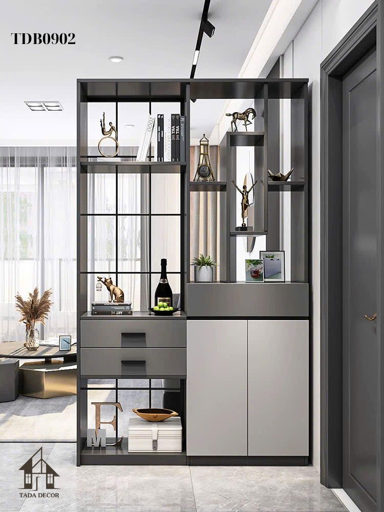 Điểm nổi bật của TDN0902 là thiết kế tủ chia nhiều ngăn, với kết cấu linh hoạt gồm các khoang kín để đồ cá nhân và khoang mở để trưng bày rượu, sách hoặc vật phẩm decor.
