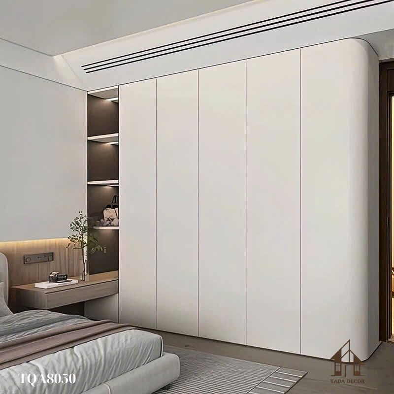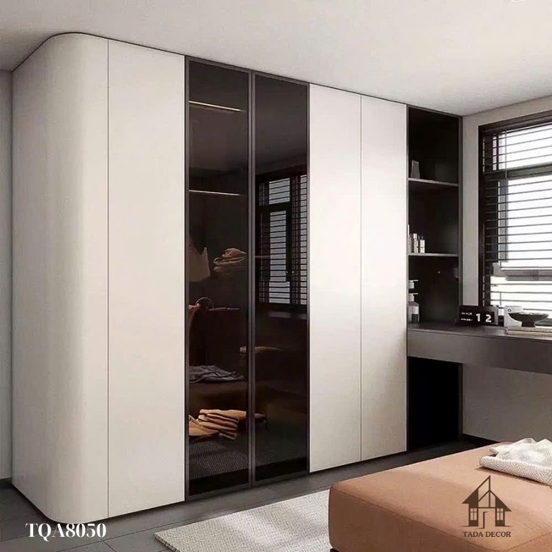Điểm nhấn của mẫu tủ TQA8050 chính là thiết kế chữ L thông minh, giúp tận dụng tối đa góc phòng, tạo cảm giác gọn gàng mà vẫn rộng rãi.