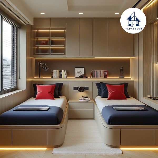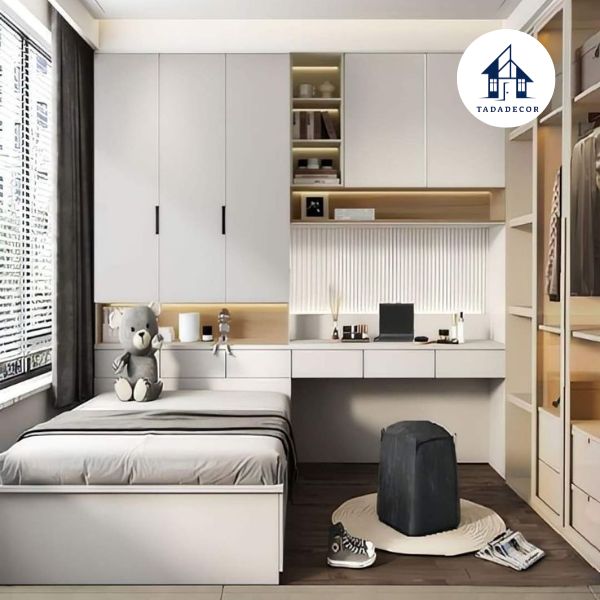 Ngoài ra, với các phòng có diện tích hạn chế, bạn nên chọn giường liền tủ có thiết kế tận dụng không gian dọc. Ví dụ, giường tầng liền tủ hoặc giường có kệ treo tường sẽ giúp sử dụng tối đa chiều cao phòng, để lại không gian sàn trống cho các hoạt động khác.
