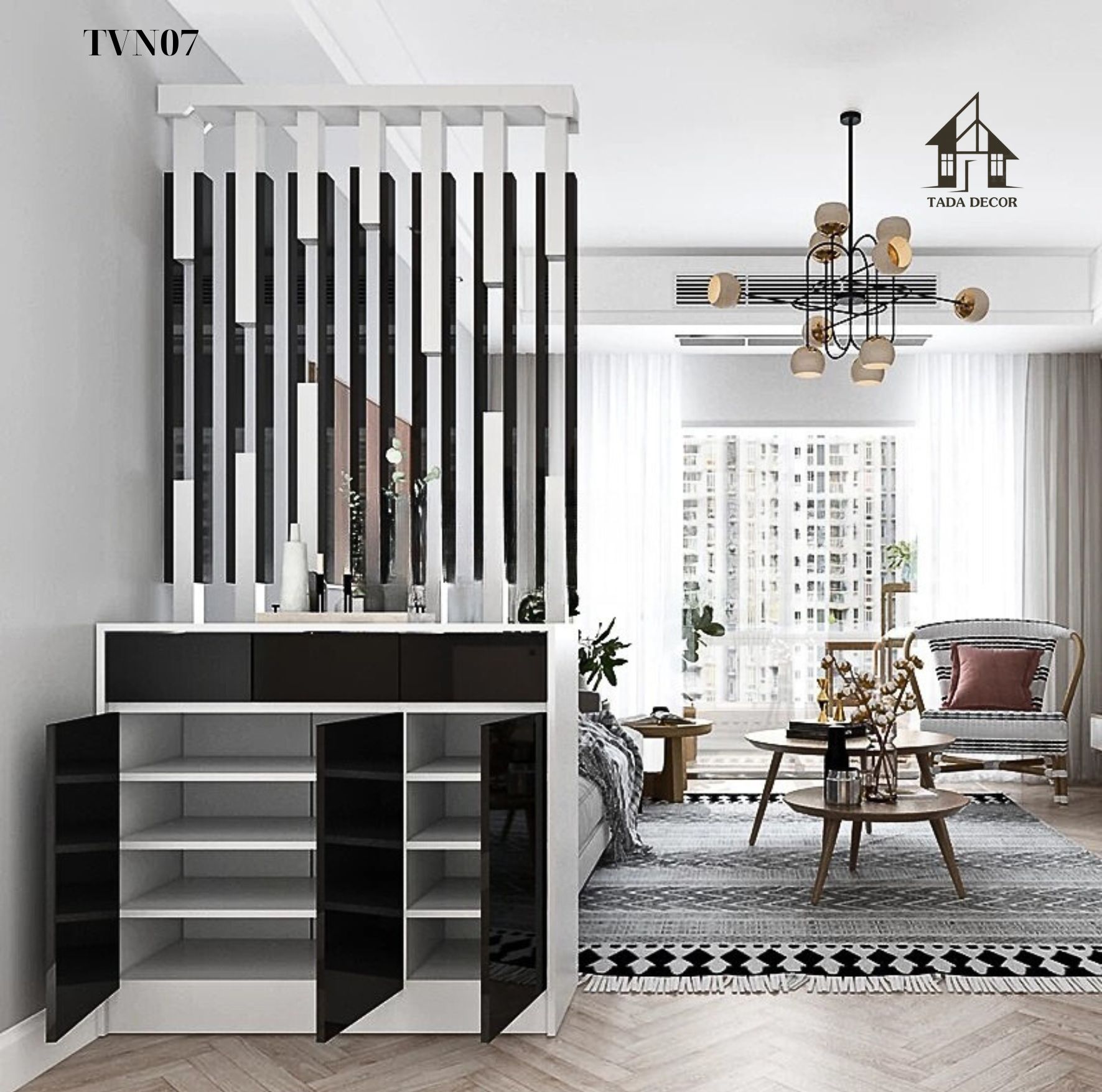 Không chỉ là vách ngăn, TVN07 còn được tích hợp tủ dưới gồm nhiều ngăn chứa rộng rãi, giúp bạn tận dụng tối đa diện tích để lưu trữ giày dép, đồ trang trí hoặc vật dụng sinh hoạt nhỏ. Đây là lựa chọn hoàn hảo cho những gia chủ yêu thích sự tiện nghi, gọn gàng nhưng vẫn muốn giữ vẻ đẹp tinh tế cho ngôi nhà.