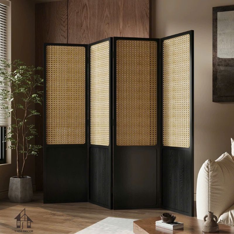 Khi đặt trong phòng khách, vách đóng vai trò như một điểm nhấn nội thất. Sự kết hợp giữa gỗ và mây giúp tạo cảm giác ấm cúng, gần gũi thiên nhiên – xu hướng được ưa chuộng ở những ngôi nhà trẻ trung, phong cách Japandi, rustic, tối giản,…