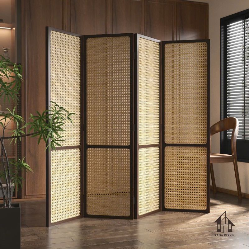 Đặt tại phòng khách, vách không chỉ tạo điểm nhấn nghệ thuật mà còn giúp che bớt các góc kém thẩm mỹ. Sự kết hợp giữa gỗ và mây mang lại cảm giác ấm cúng, nhẹ nhàng – phù hợp với các không gian yêu thích sự mộc mạc.