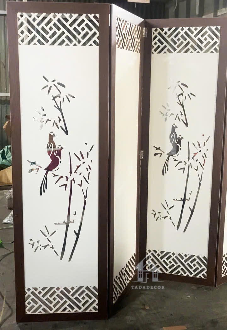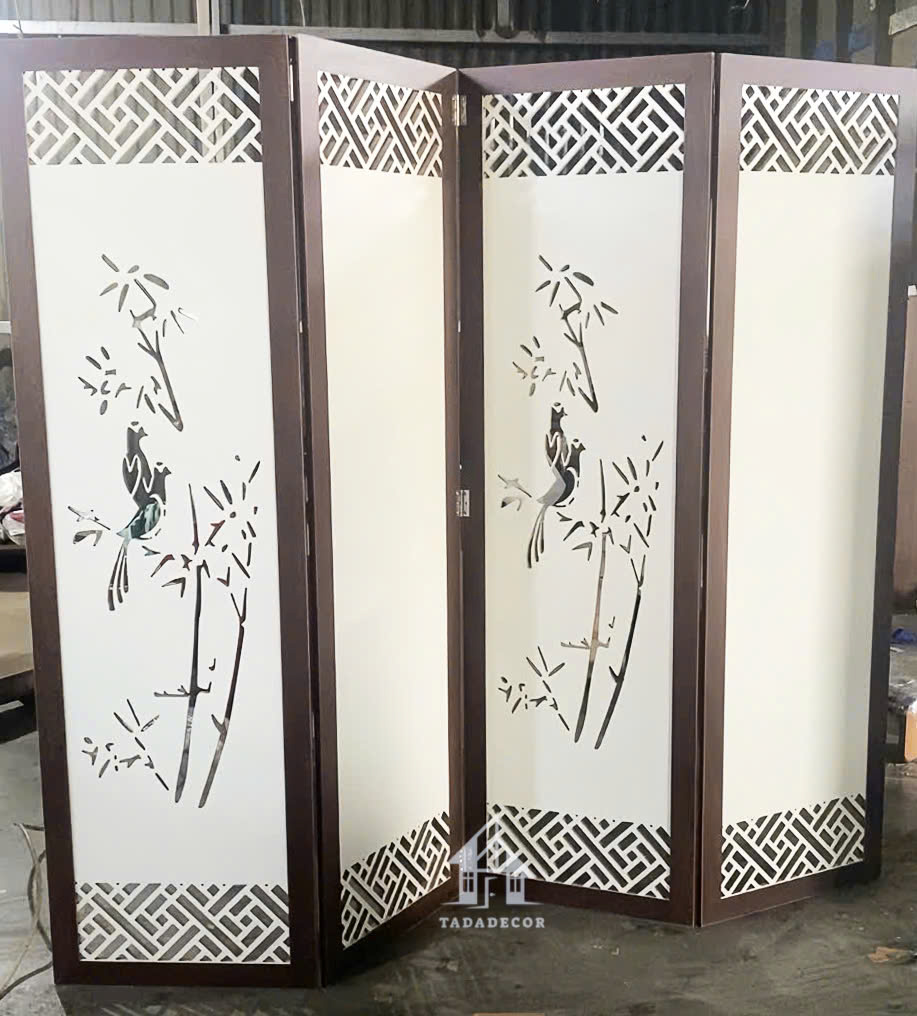 Vách Bình phong ngăn phòng di động hoa văn chim trúc phối màu óc chó mẫu mới 2024- TDVN55