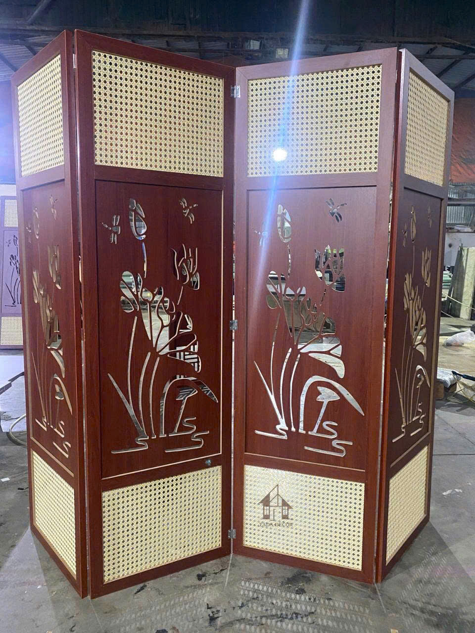 Vách ngăn bình phong cánh gỗ phối mây CNC hoa sen gỗ MDF