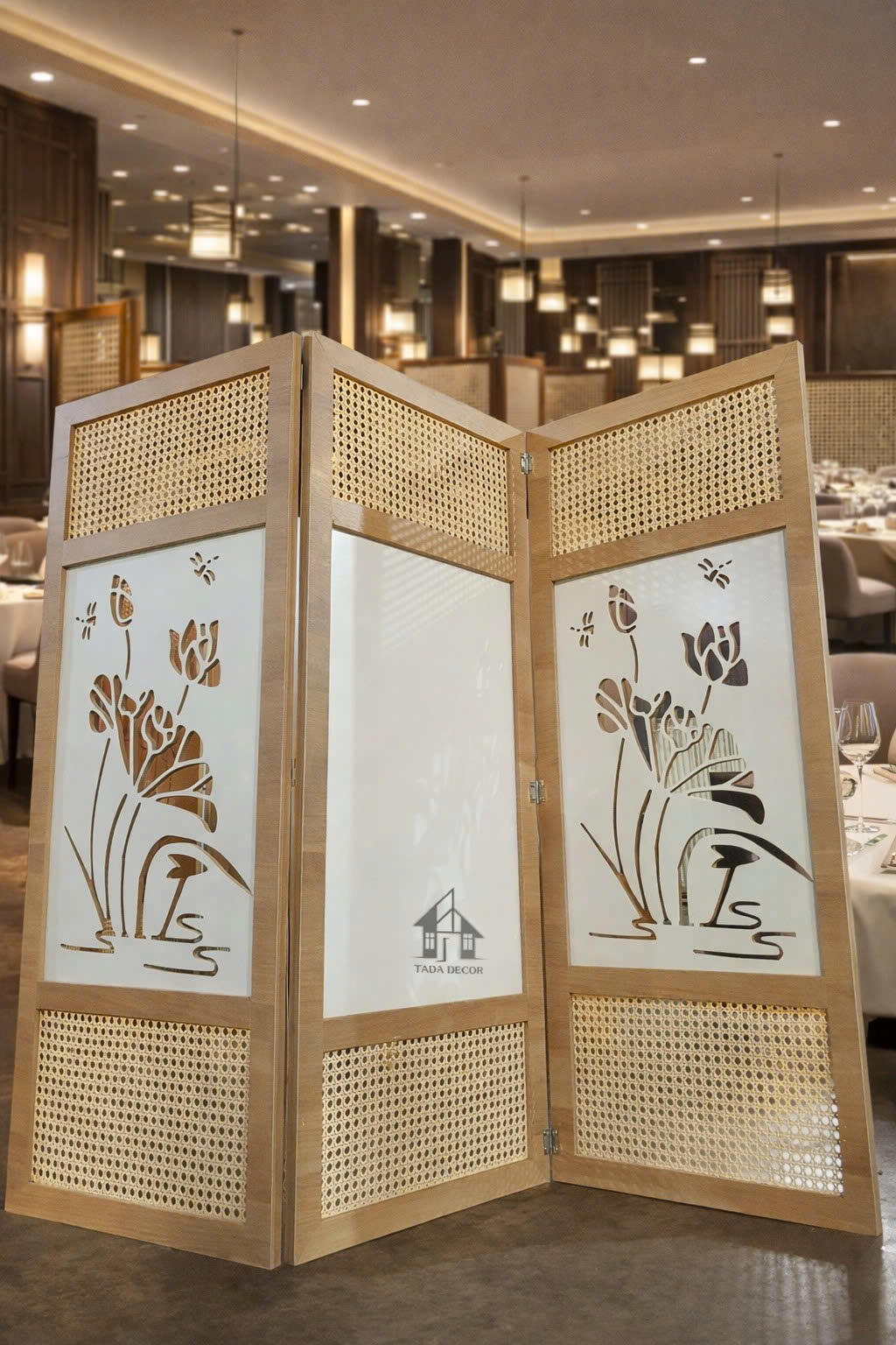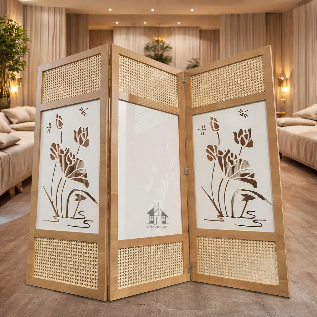Với thiết kế đẹp mắt cùng họa tiết hoa sen tinh xảo, chiếc vách ngăn decor phối mây sẽ giúp không gian sống của bạn trở nên sang trọng và ấm cúng hơn.